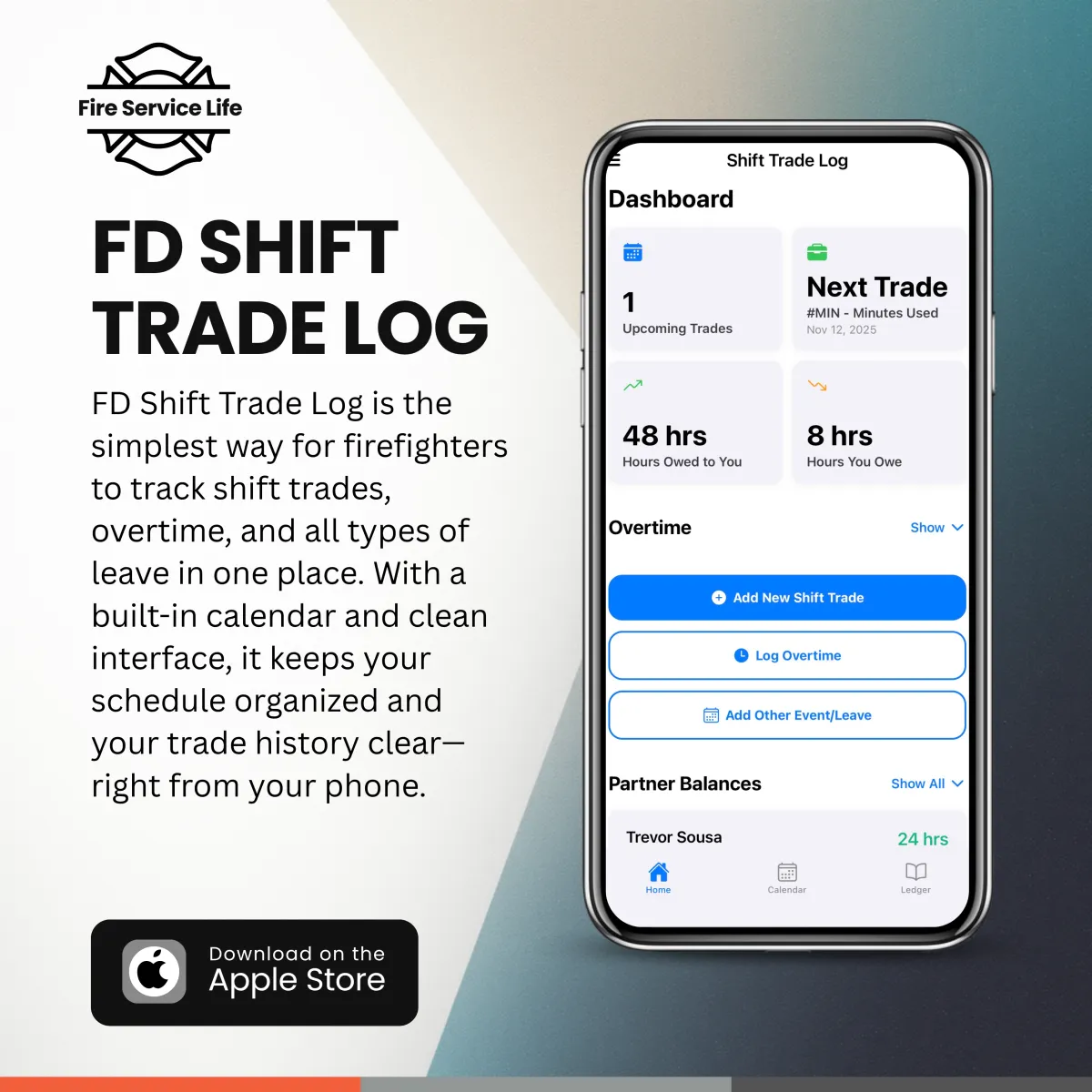 Simplify your schedule with the FD Shift Trade Log—an iOS app built for firefighters to track shift trades, overtime, and leave with ease. For just $2.99, stay organized, eliminate confusion, and keep your trade history clear and accessible right from your phone.